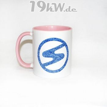 Auf der Tassenrückseite ist das neue Sachsenringzeichen-Motiv, bestehend nur aus Begriffen rund um den Trabant.