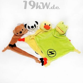 Die Plüsch-Schnuffeltücher gibt es als Ente, Frosch, Teddybär und Panda.