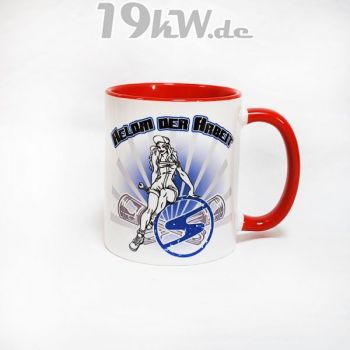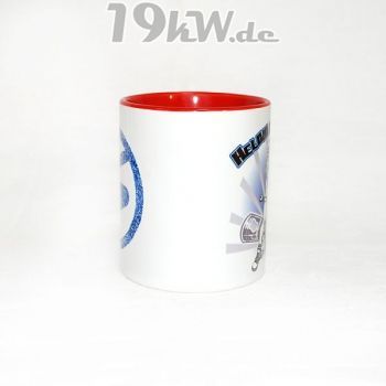 Auf der Tassenrückseite ist das neue Sachsenringzeichen-Motiv, bestehend nur aus Begriffen rund um den Trabant.