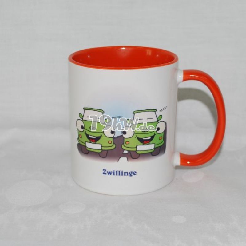 Tasse beidseitig bedruckt mit farbig abgestimmter Innenseite und Henkel.